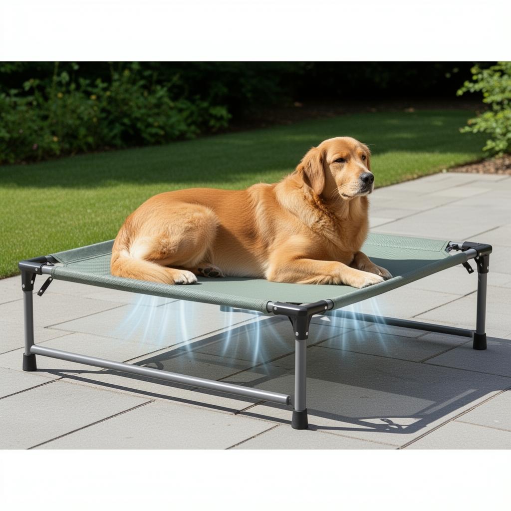 Keep your dog cool and comfortable off the ground. Breathable mesh fabric promotes air circulation. Durable steel frame supports dogs up to 100 lbs. Easy snap-together assembly — no tools needed. Indoor and outdoor use. Shipping: U.S. shipping available.